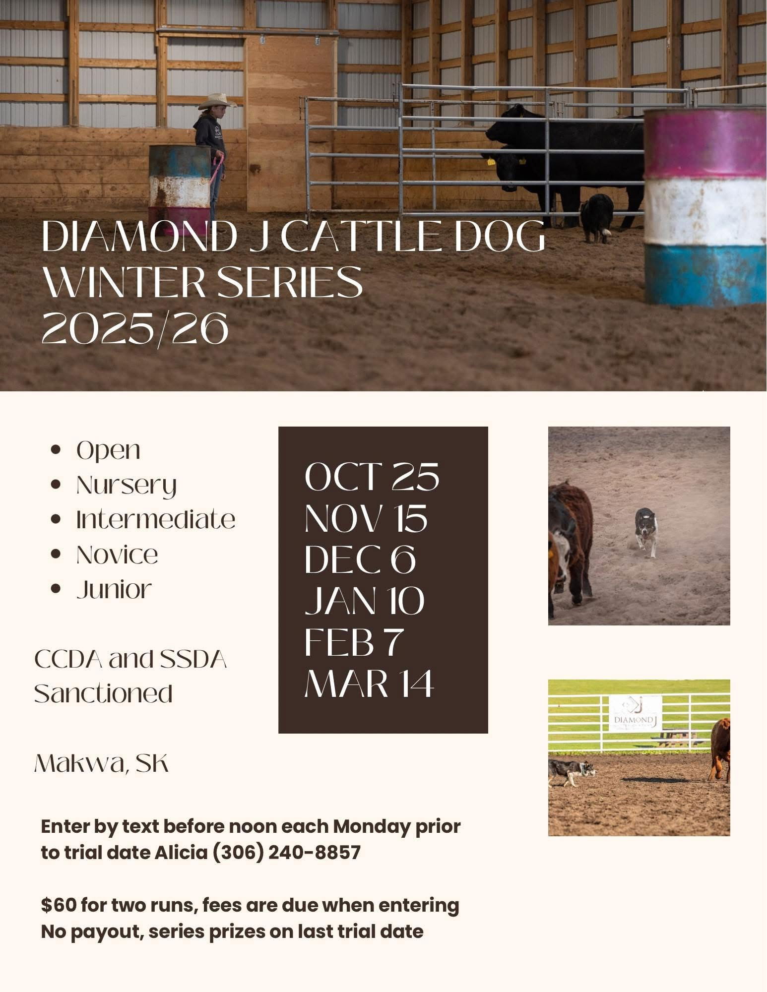 Cattle Arena Series Open,Nursery,Intermediate,Novice,Junior CCDA & SSDA Sanctioned Dates: October 25, 2025 - November 15, 2025 - December 6, 2025 - January 10, 2026 - February 7, 2026 - March 14, 2026 Entries open noon each Monday prior to trial Date. Read Poster for more information!